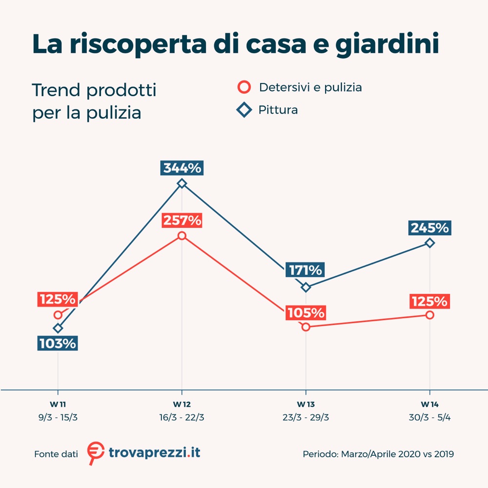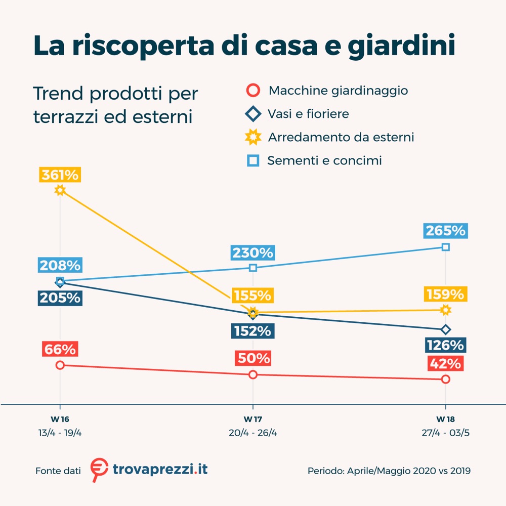 Nelle settimane successive, complice il primo caldo e l’arrivo delle belle giornate, l’interesse degli italiani si è concentrato su prodotti per il giardino, ma anche per terrazzi e balconi.
