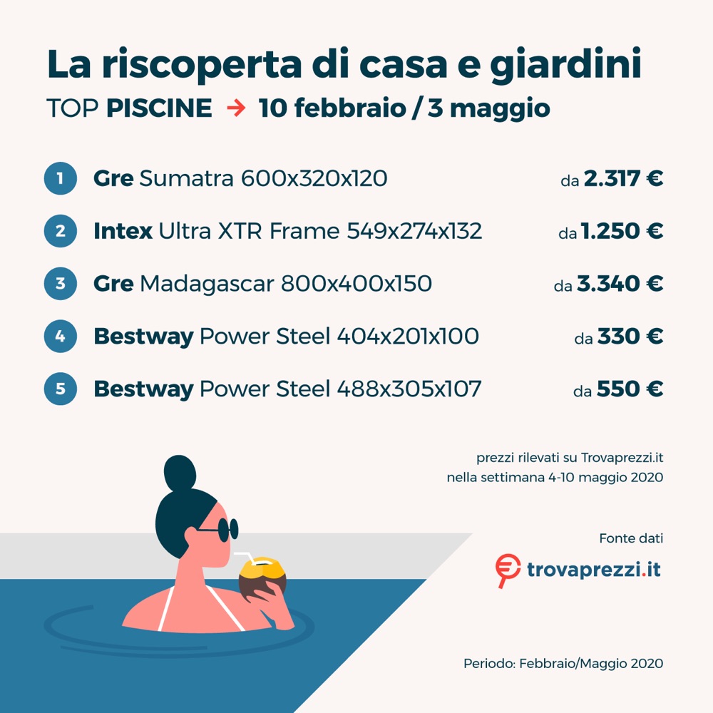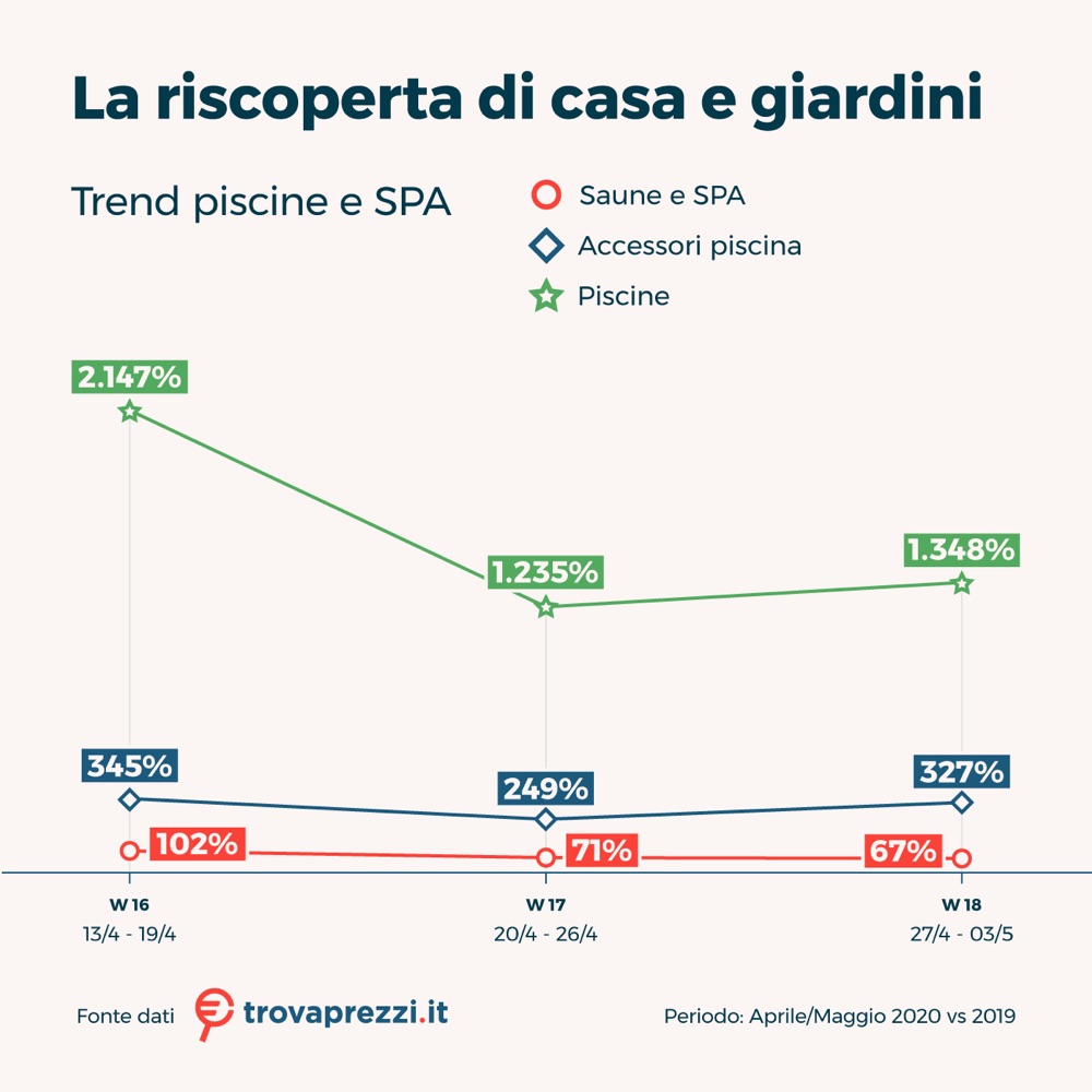 In vista dell’estate, data l’incertezza relativa alle prossime vacanze estive, non è mancato l’interesse per le piscine: nella settimana 13-19 aprile sono state registrate circa 105mila ricerche (+2147% rispetto all’anno precedente), oltre 81mila (+1235%) durante la settimana successiva e 92mila (+1348%) tra il 27 aprile e il 3 maggio.