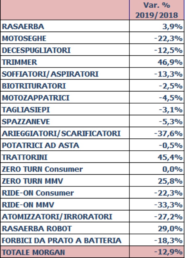 Nel corso del 2019 a pesare sulle dinamiche di mercato sono state soprattutto le condizioni meteo-climatiche. Il primo trimestre del 2019, caratterizzato da temperature miti che avevano determinato un’anticipazione dell’attività vegetativa delle piante, aveva infatti trainato le vendite di macchine per il giardinaggio, facendo registrare un +29%.
