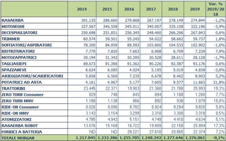 Il mercato delle macchine e delle attrezzature per il giardinaggio e la cura del verde chiude il 2019 con un livello di vendite sostanzialmente in linea con il 2018.