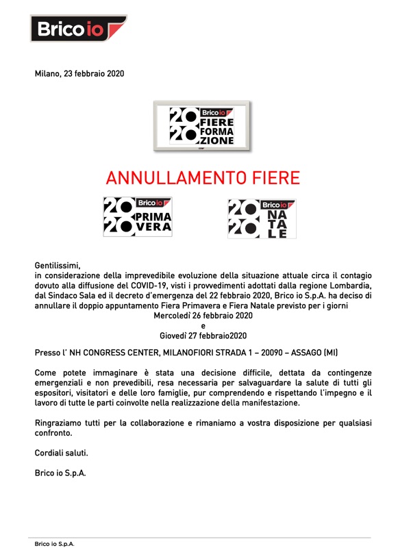 Allo stesso modo i due eventi previsti per il 26 e il 27 febbraio, organizzati da Brico Io per le campagne primavera 2020 e Natale 2020, sono stati annullati, senza poter al momento prevedere una possibile data futura.