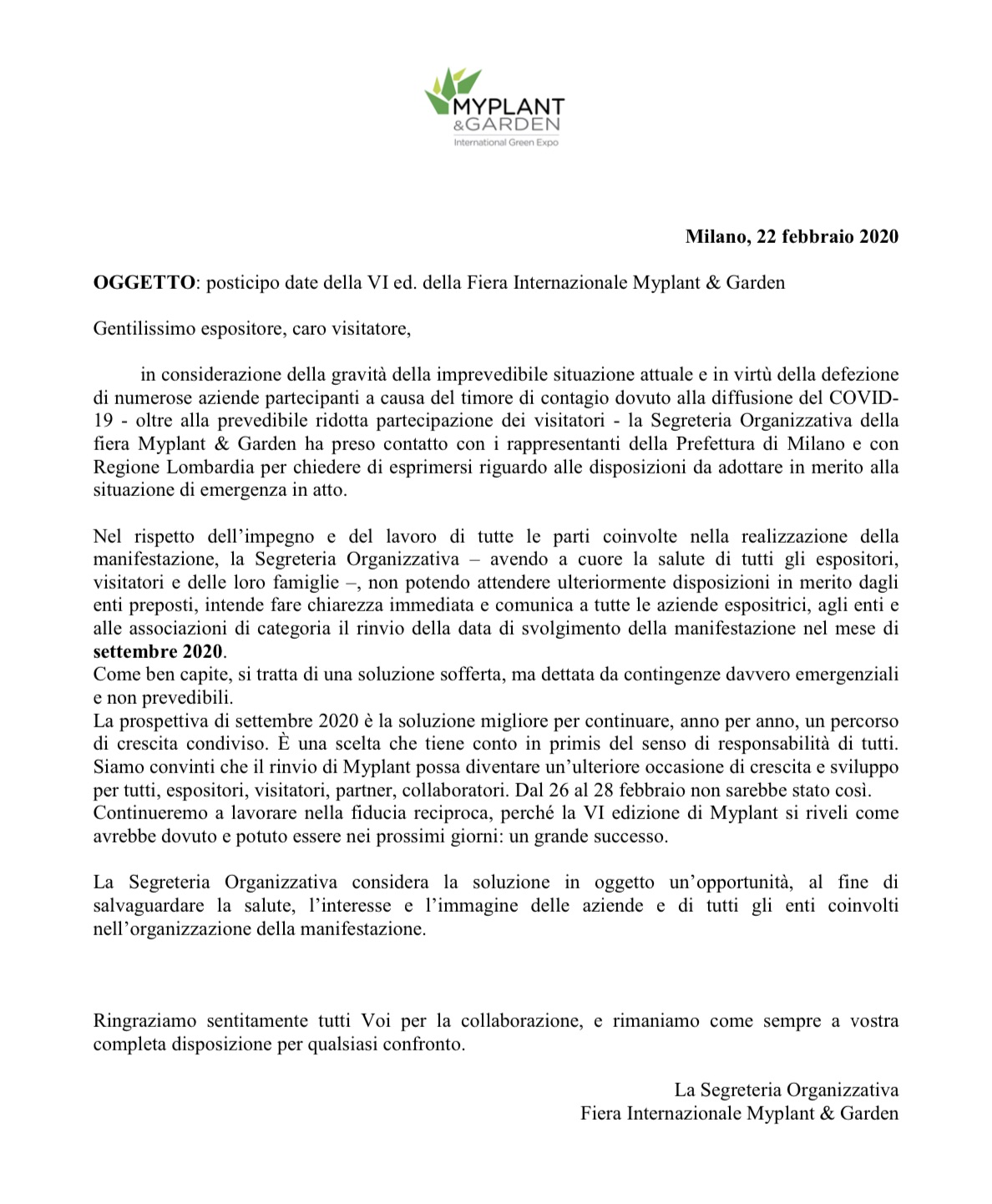 Un week end orribile per le manifestazioni fieristiche di prossima apertura. MyPlant&Garden, fiera del florovivaismo, prevista dal 26 al 28 febbraio nel quartiere di Fiera Milano a Rho-Pero è stata rimandata a settembre.