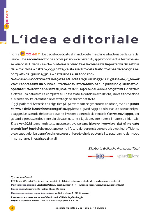 Nato dalla collaborazione tra i magazine MG Marketing Giardinaggio e IL giardiniere, E_Power 2025 rappresenta un punto di riferimento informativo per un pubblico qualificato di operatori: rivenditori specializzati, manutentori, imprese del verde e progettisti. L’obiettivo è offrire una panoramica completa su un mercato in continua evoluzione, dove l’innovazione e la sostenibilità diventano leve strategiche di competitività.