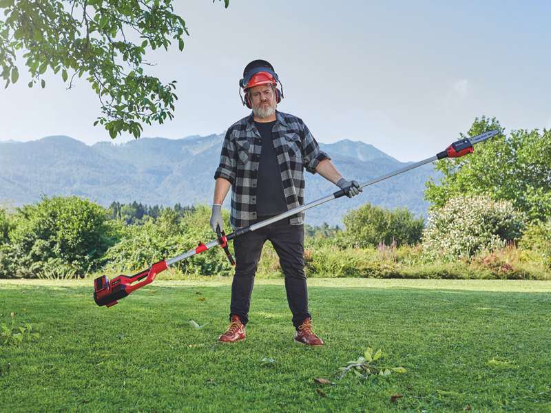 L’utensile viene fornito con una lama a 3 denti e un’asta di prolunga per siepi e rami alti, nonché una maniglia e un’imbracatura aggiuntive regolabili.