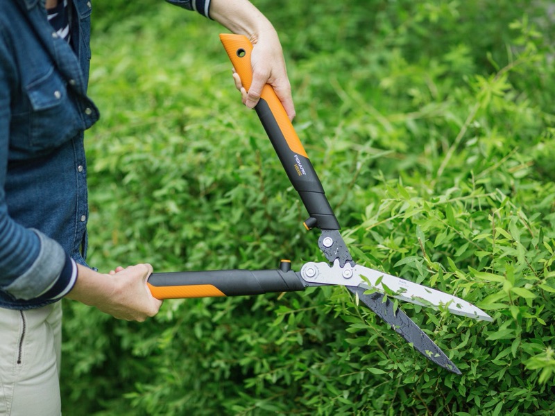 Meno sforzo e più potenza con gli attrezzi Fiskars PowerGear X: forbici e cesoie siepi per un giardino potato con cura.